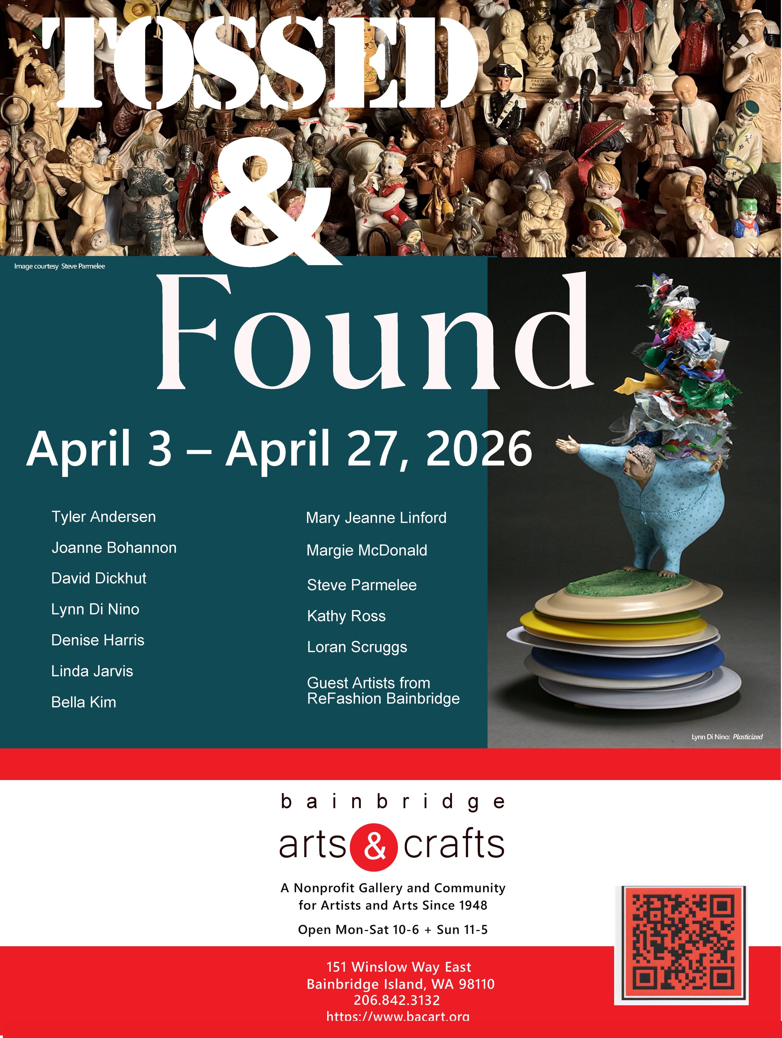 Featuring work by Joanne Bohannon, David Dickhut, Lynn Di Nino, Denise Harris, Linda Jarvis, Mary Jeanne Linford, Margie McDonald, Steve Parmelee, Kathy Ross, Loran Scruggs, Tyler Andersen, and guest artists from ReFashion Bainbridge.